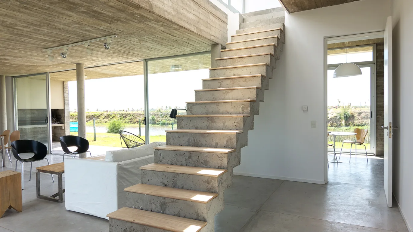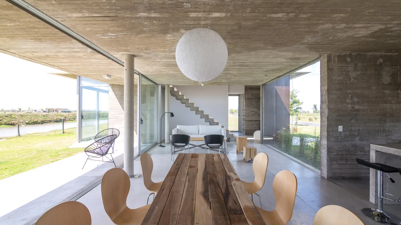 Los límites del terreno al que hacemos referencia parecieran fugarse hacia el ineludible foco visual: la laguna. En lo referido a la funcionalidad de esta vivienda, planteamos espacios flexibles, para que se pudieran adaptar, tanto a la vida socialmente activa de nuestro cliente como a las necesidades de su futura familia, procurando no restringir otros usos posibles. La flexibilidad planteada permite aislar el sector privado desarrollado en planta alta, del sector público ubicado en la planta baja.