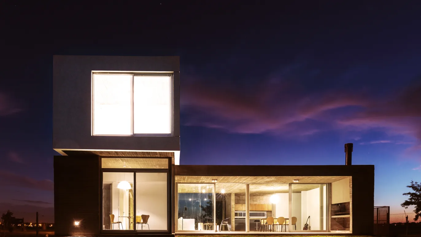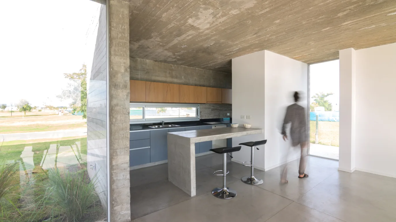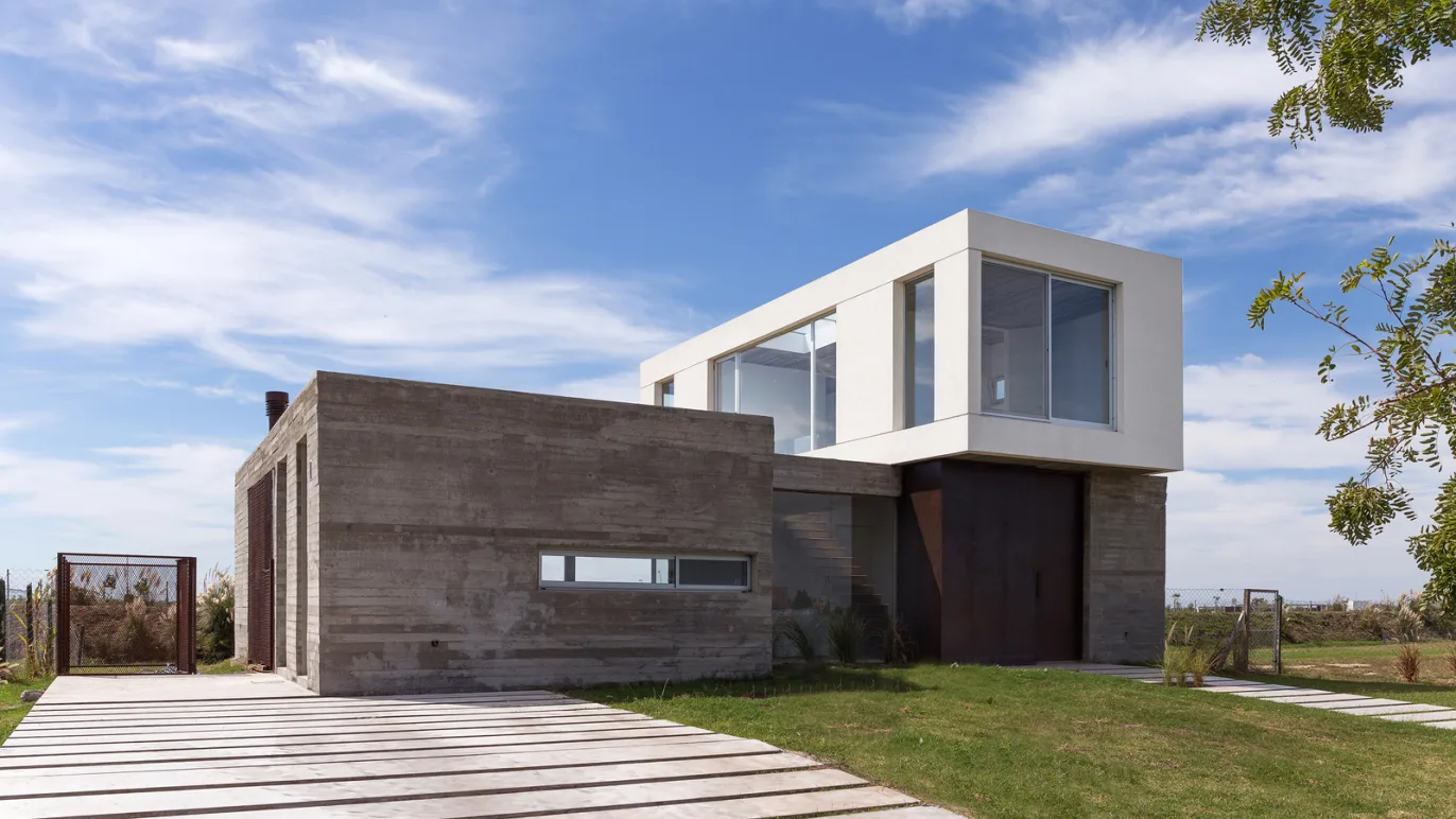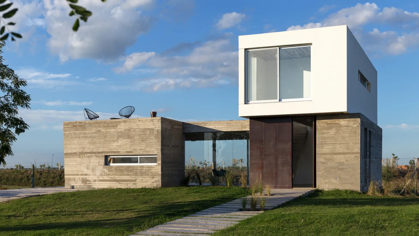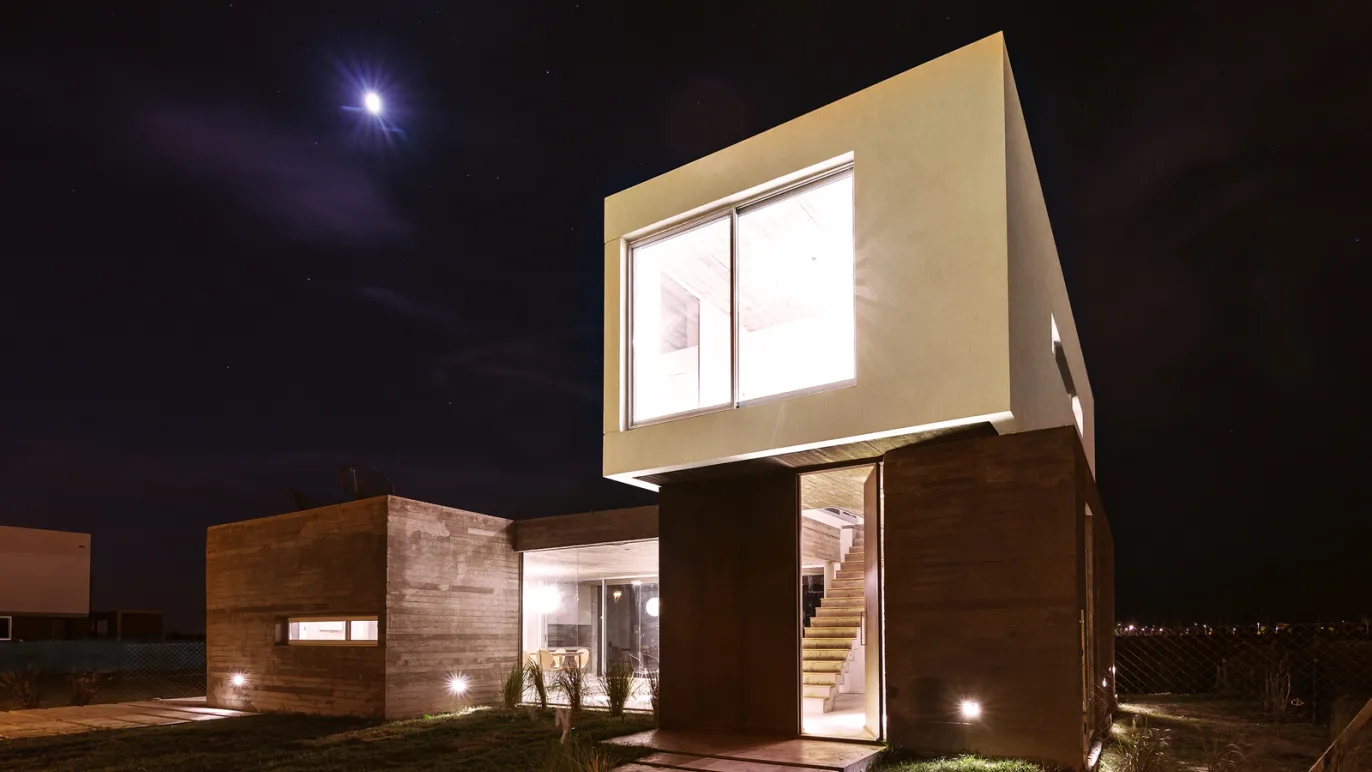 El juego volumétrico exterior e interior, se desmaterializa hacia el contrafrente, orientación norte, resolviendo así la apertura visual de los ambientes principales hacia la laguna, y un frente más ciego que contiene el área de servicios, orientación sur, dota de privacidad a la vivienda.