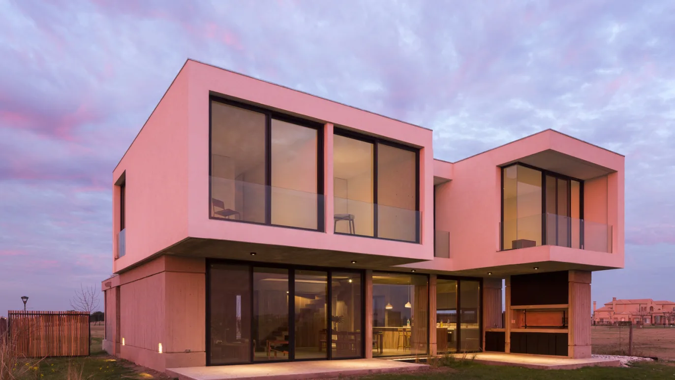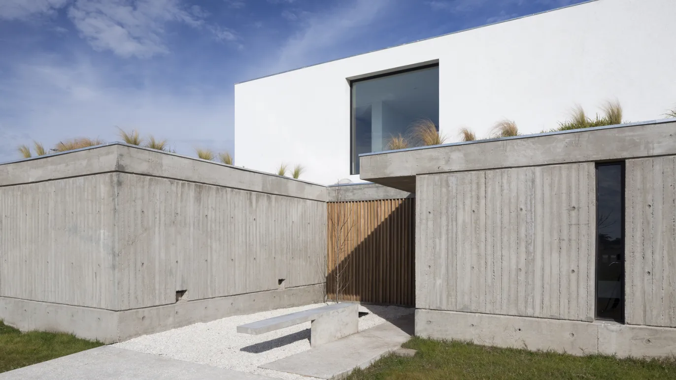 La morfología de la casa se resuelve cerrándose hacia el frente con un gran basamento de hormigón, y se desmaterializa hacia el contrafrente, resolviendo así la gran apertura visual de los ambientes principales hacia la cancha de golf, generando diversos encuadres que enfatizan la mirada del usuario.