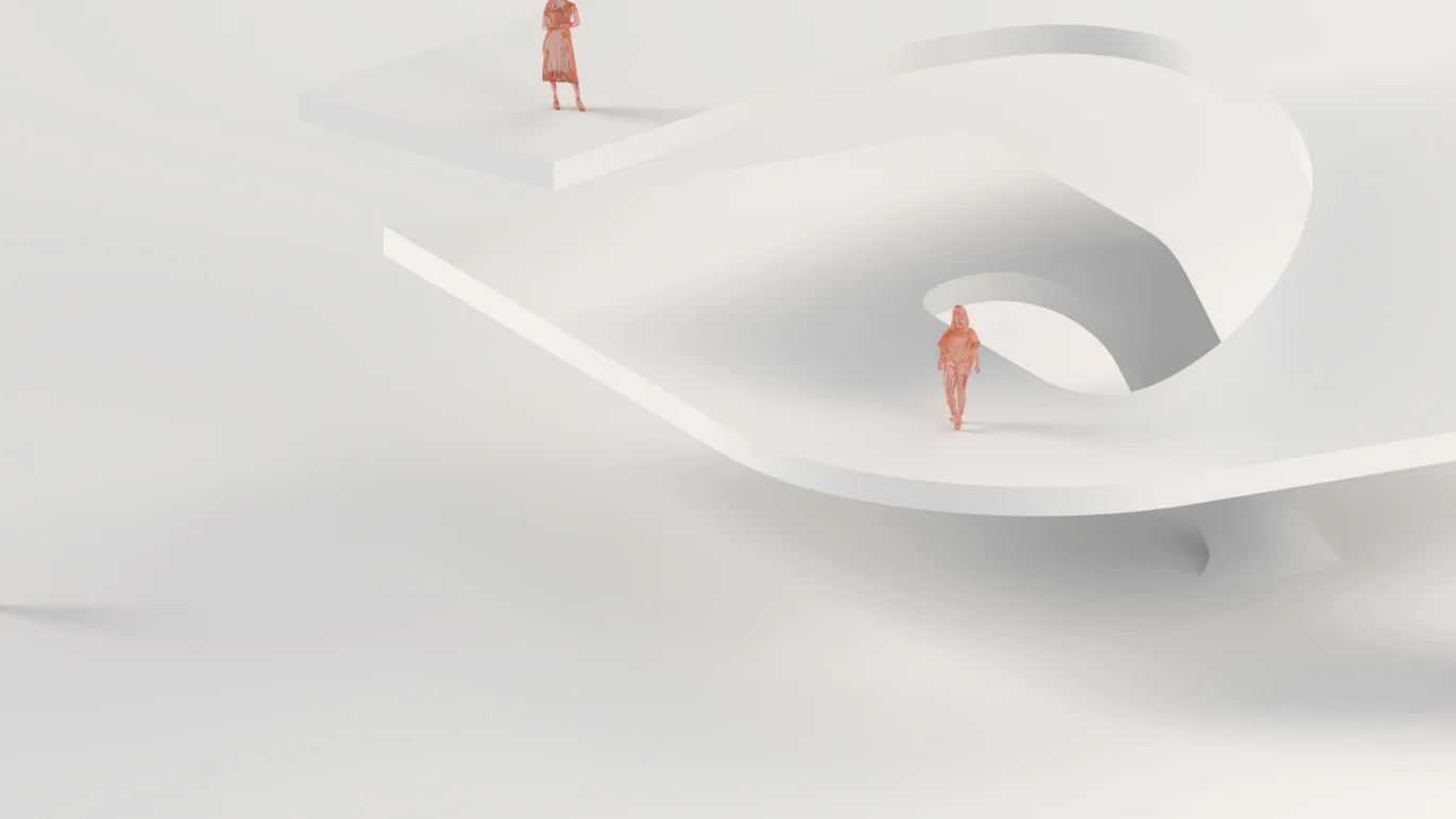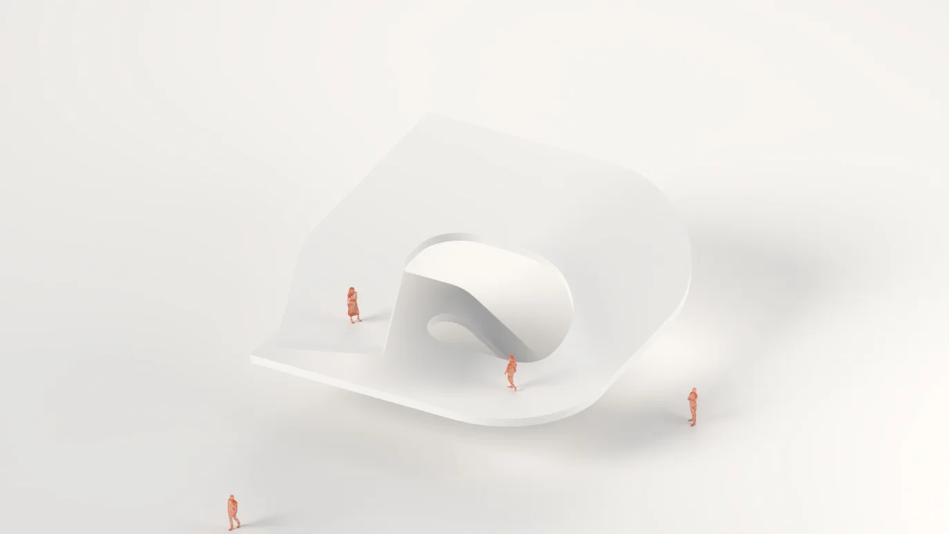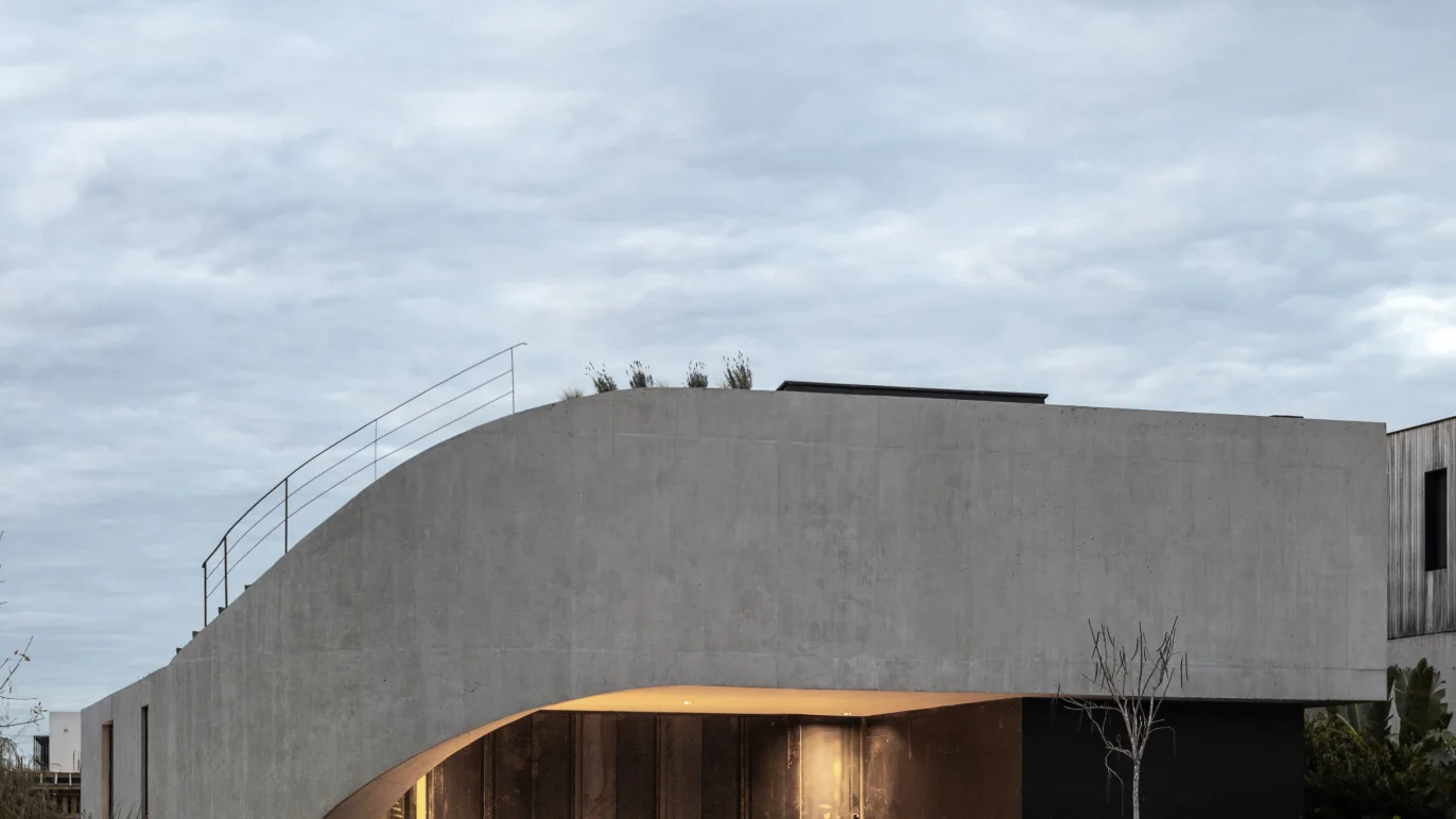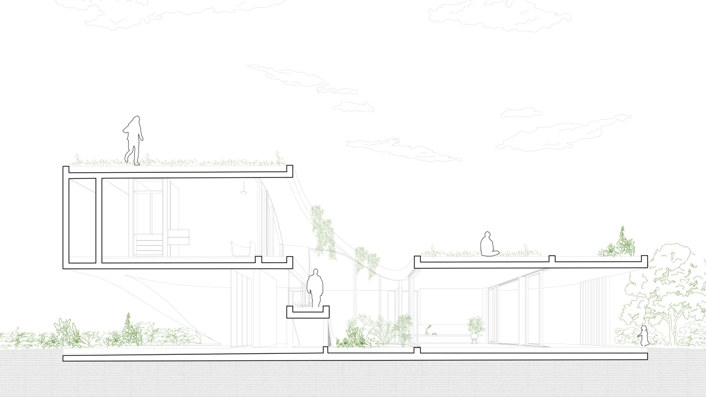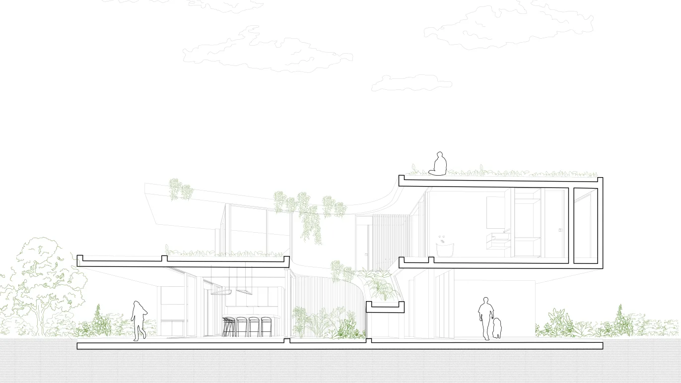 GP House emerges from the dialogue between two curves: the bend of the corner street and the arc of the lagoon that opens at the back of the plot. Between them, a spiral unfolds, shaping both the organization of the project and the experience of inhabiting it.
