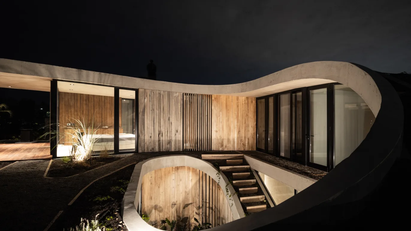 The spiral not only defines circulation but also gives form to the spaces and their relationship with the surroundings. The house opens toward the lagoon, framing views and creating platforms for contemplation, while turning away from the streets to reinforce privacy and its character as a refuge.