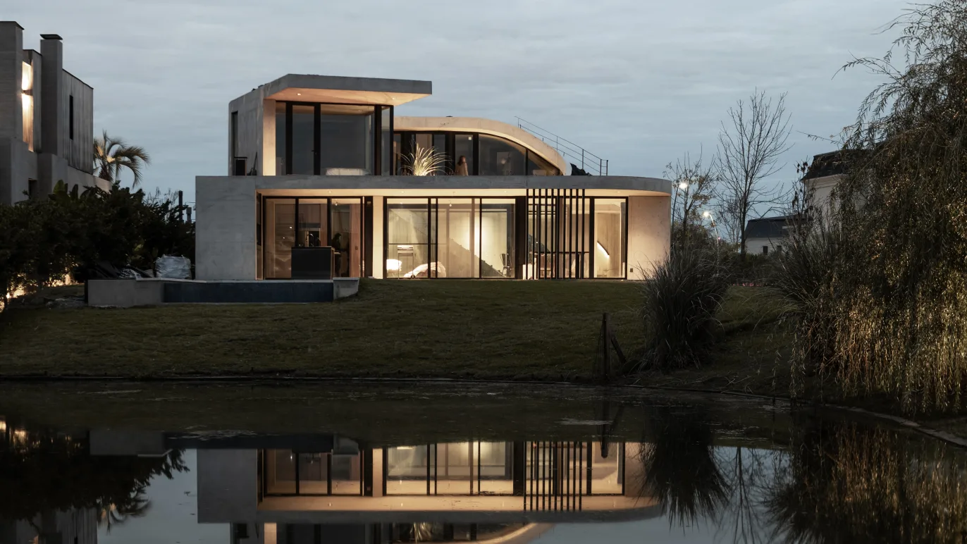 Materiality strengthens this fluid gesture: concrete is conceived not as a heavy mass but as a liquid stone, flowing with the curves of the project and resonating with the movement of the surrounding streets. Lighter and more transparent surfaces, in turn, open the house toward the lagoon. The dialogue between opacity and transparency intensifies the spiral as a device of transition.