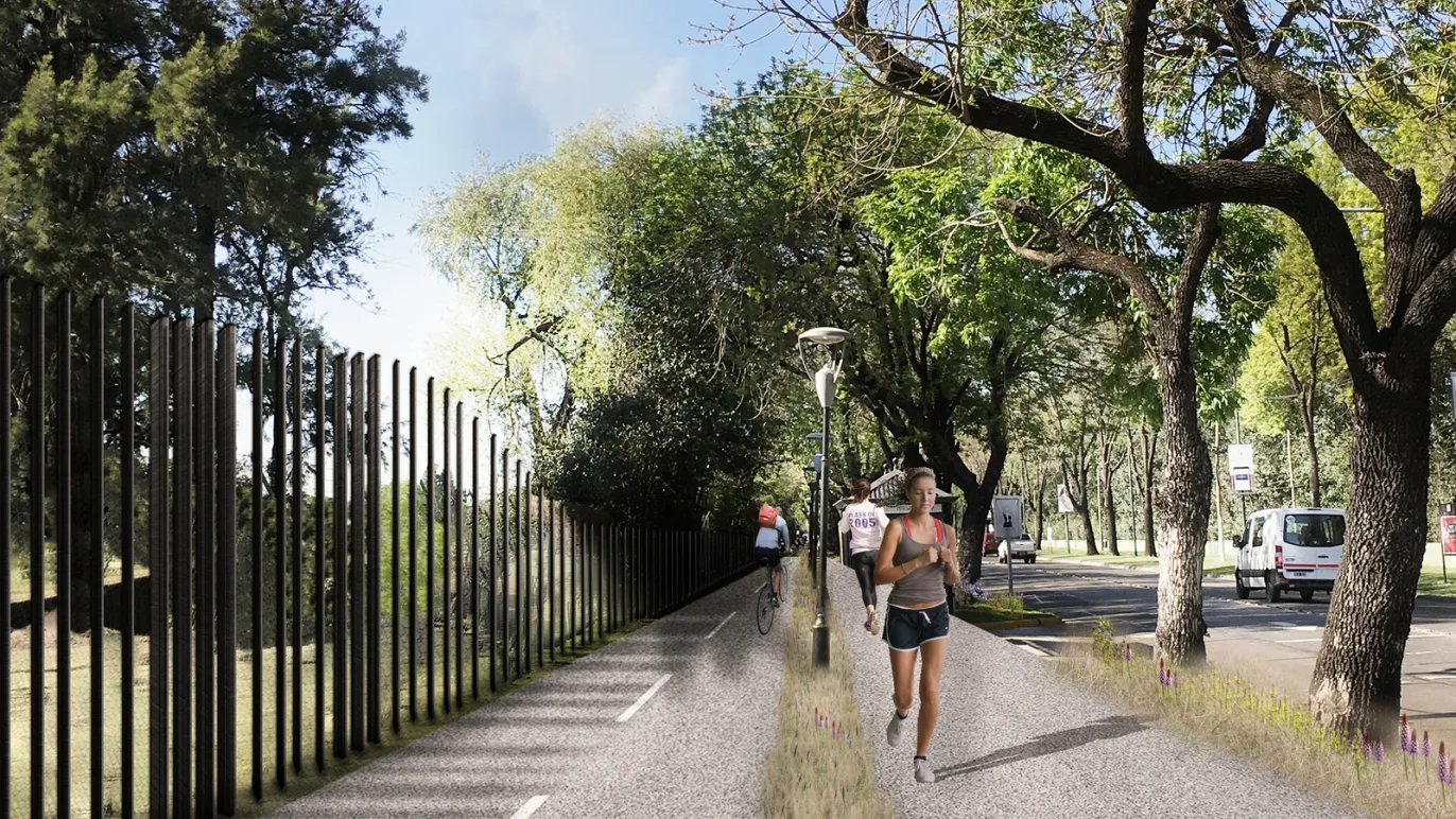 Un sistema de caminos porosos y absorbentes para caminos, veredas y solados y equipamientos completan el Parque Lineal de San Isidro utilizado por peatones, ciclistas, estudiantes y público del PLSI.