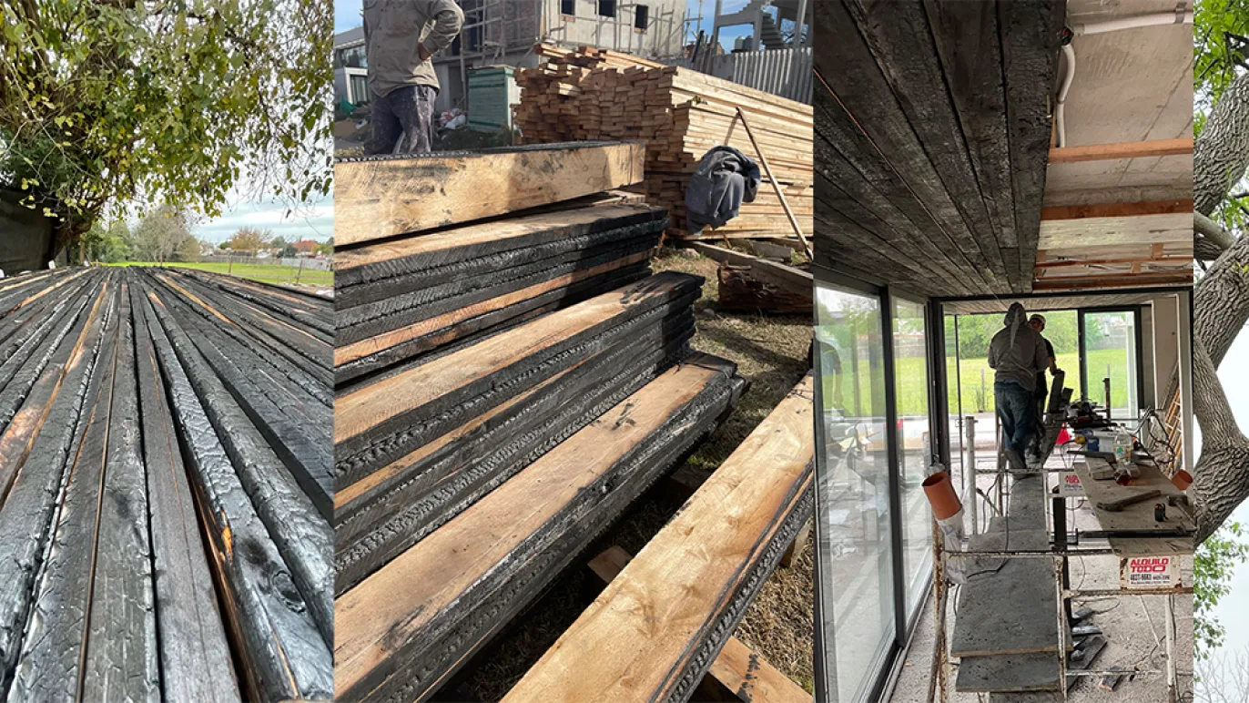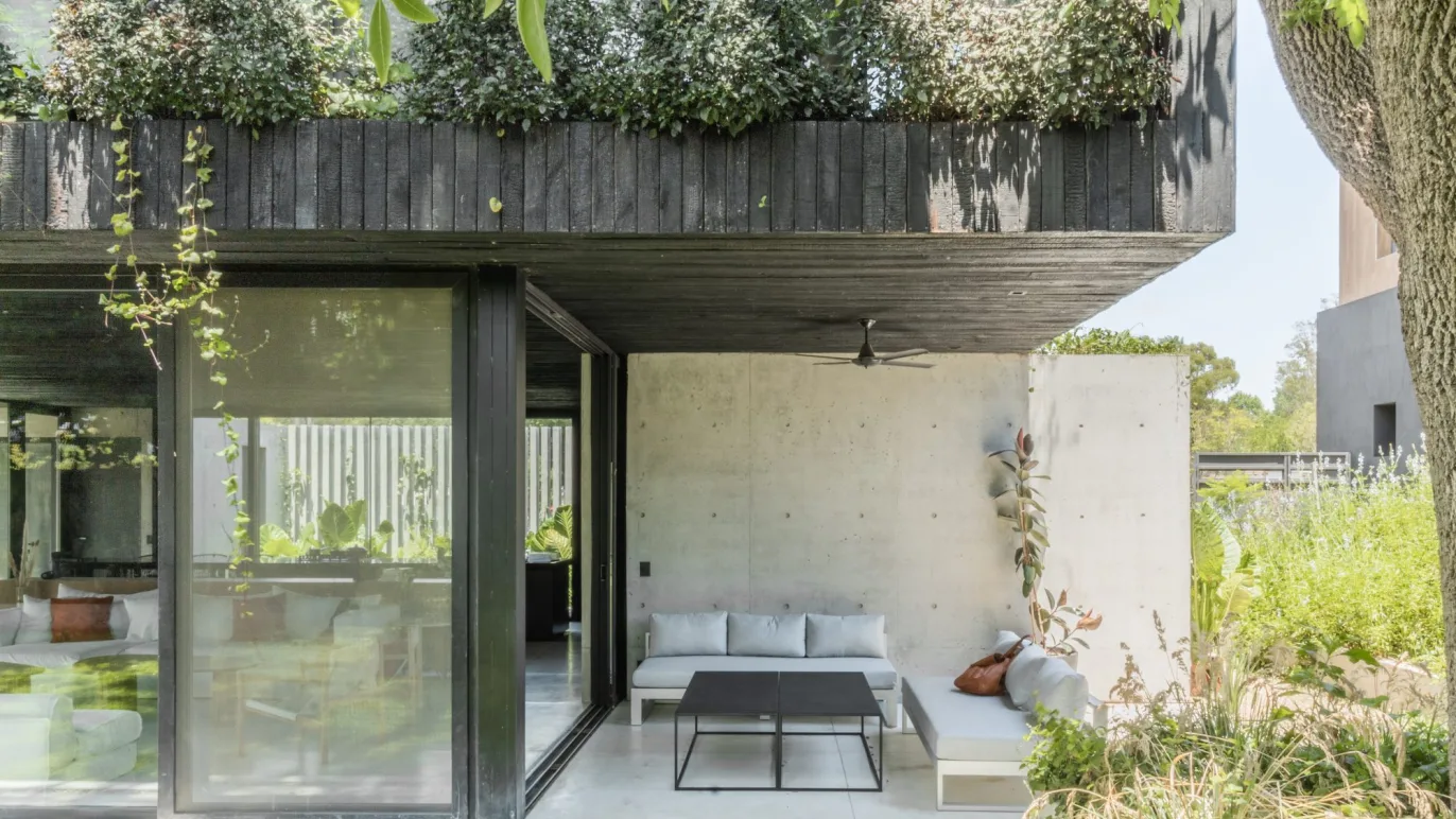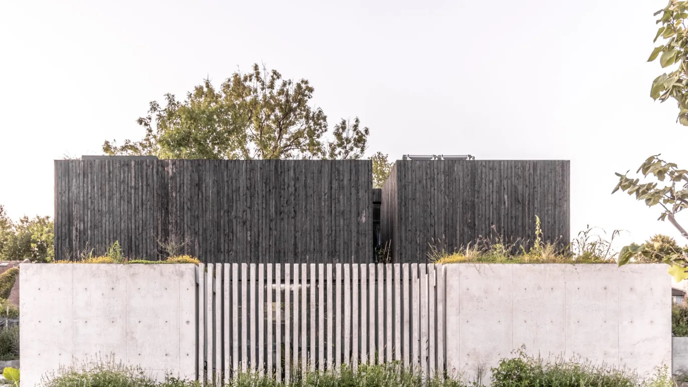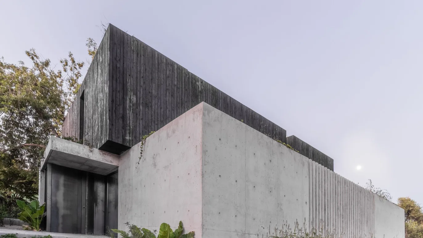 The project is composed by a noble material palette: Concrete on the ground floor and a charred wood volume on the upper floor (using the Japanese ancient technique Shou Sugi Ban). Their selection and composition isn’t by chance, but well thought out. For instance, the concrete structure on the ground level allows for spatial amplitude, essential for the visual expansion from the heart of the house. Furthermore, burnt wood is not only insect repellent, water and fireproof, but it provides the perfect natural frame to enclose the visuals, with a monolithic frame. In the evening, the charcoaled wood ceiling dark tone is heightened as it merges outwards with the night sky
