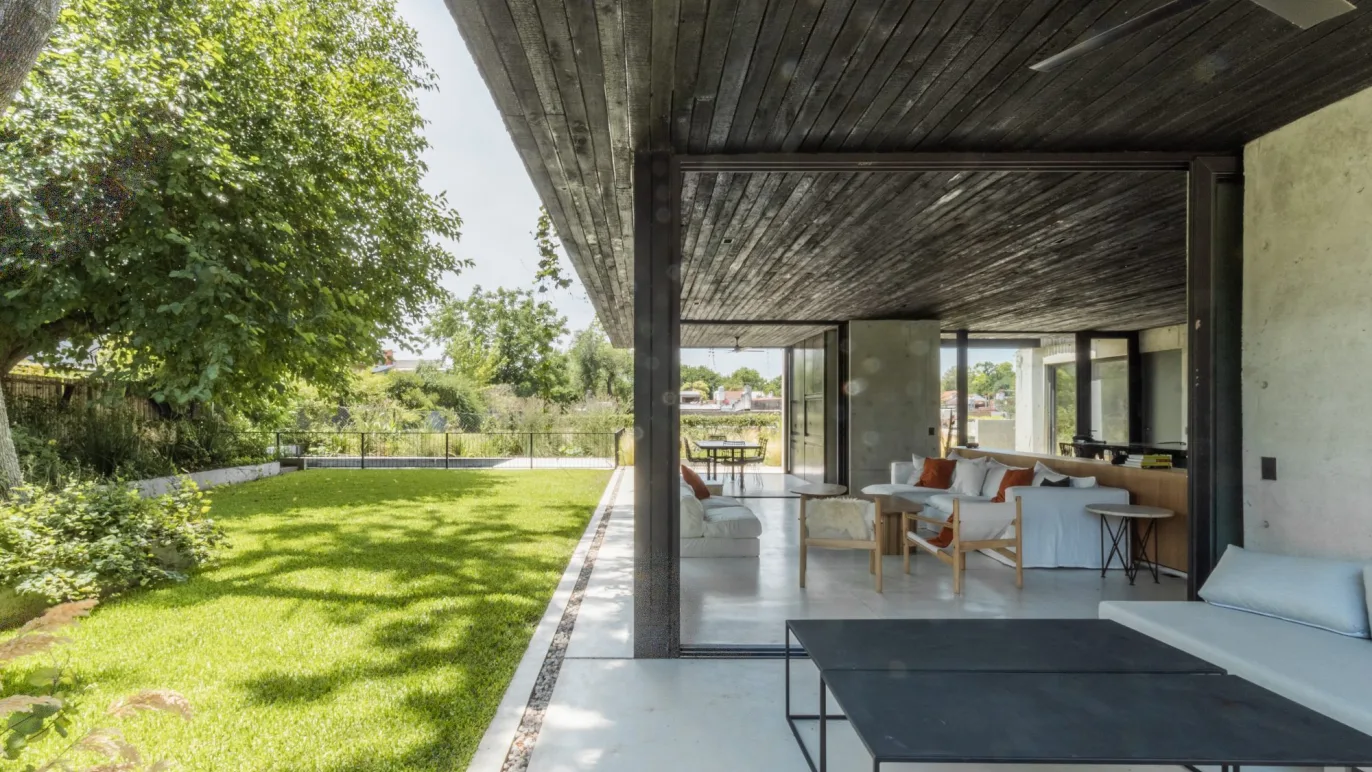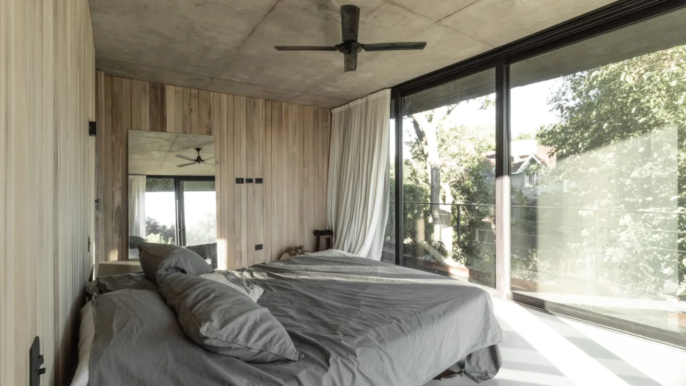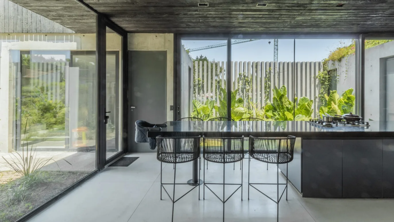 Its remarkable how the heart of the house, while being in the geographic center, still gives the impression of being on the outside. The interior / exterior limits are blurred by the architectural elements, such as the floor to ceiling windows that disappear behind the concrete walls. These support the upper floor volume, where the private dimension takes place, floating amongst the ash’s tree tops and once again, dematerializing the boundary that separates the outside from the inside.