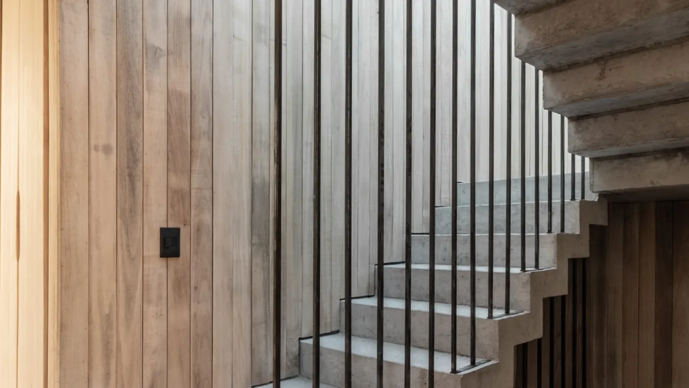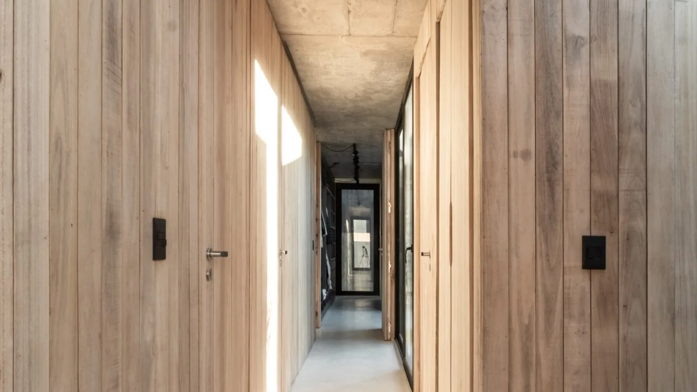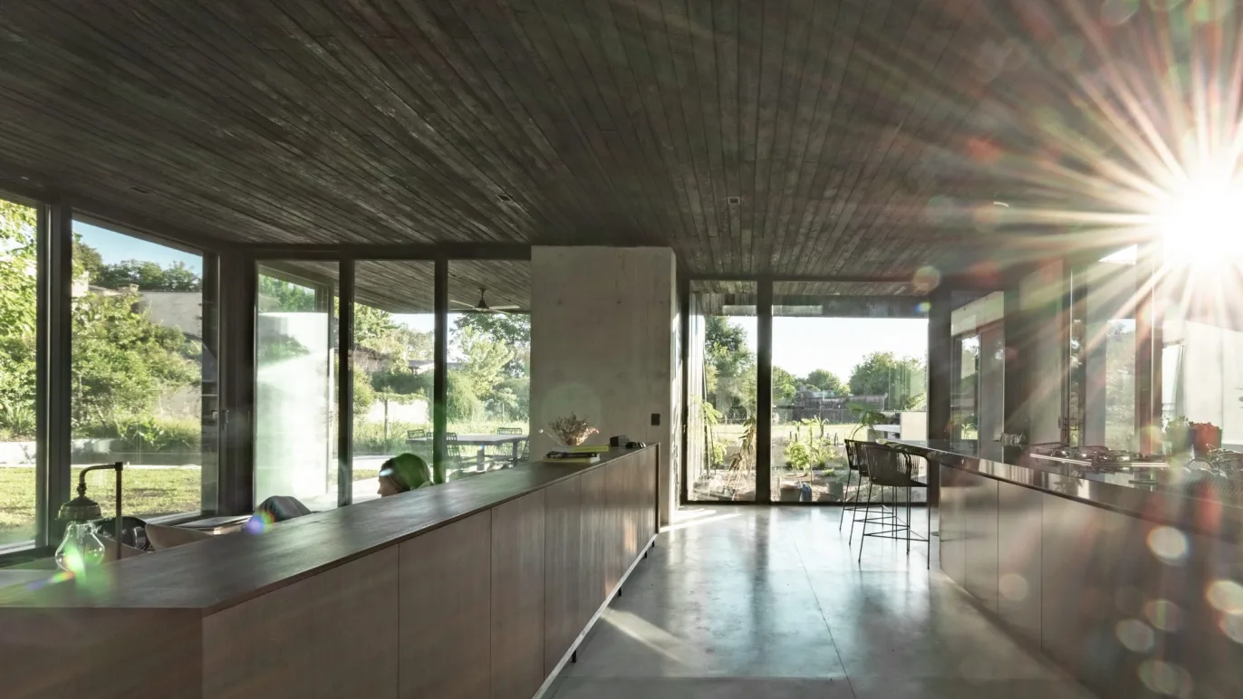 The result is a simultaneously opened and closed space. Conceived to be environmentally efficient, all of its spaces are naturally ventilated and illuminated, with eaves that act as a barrier during the summer, and which allow the sun to come through during the winter. The house is shut towards the south, but it opens up towards the north. The ventilation and lighting fluxes are essential to MeCa, and there is where materiality takes a leading role.