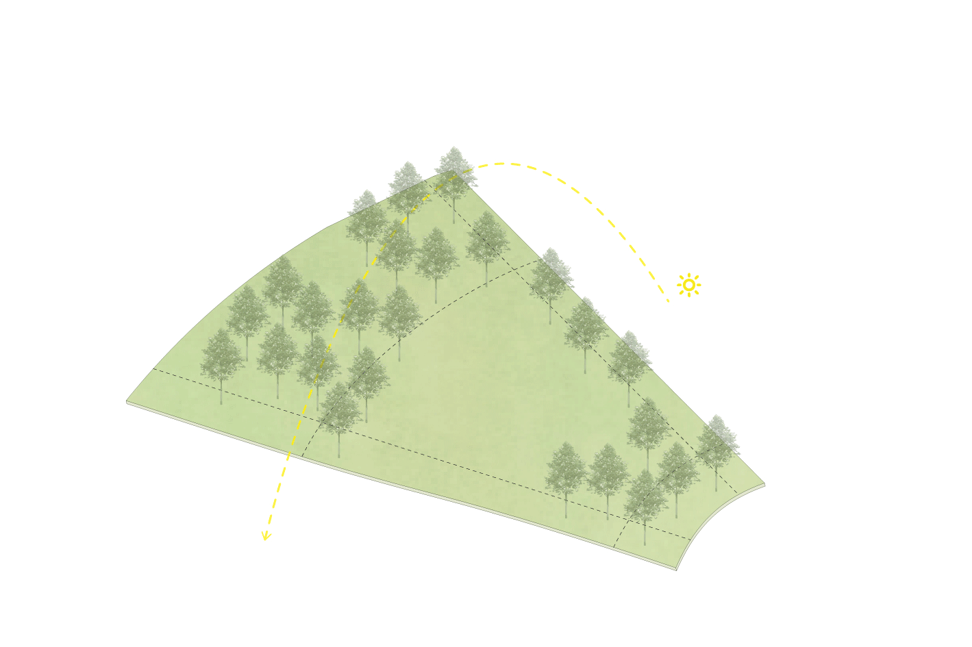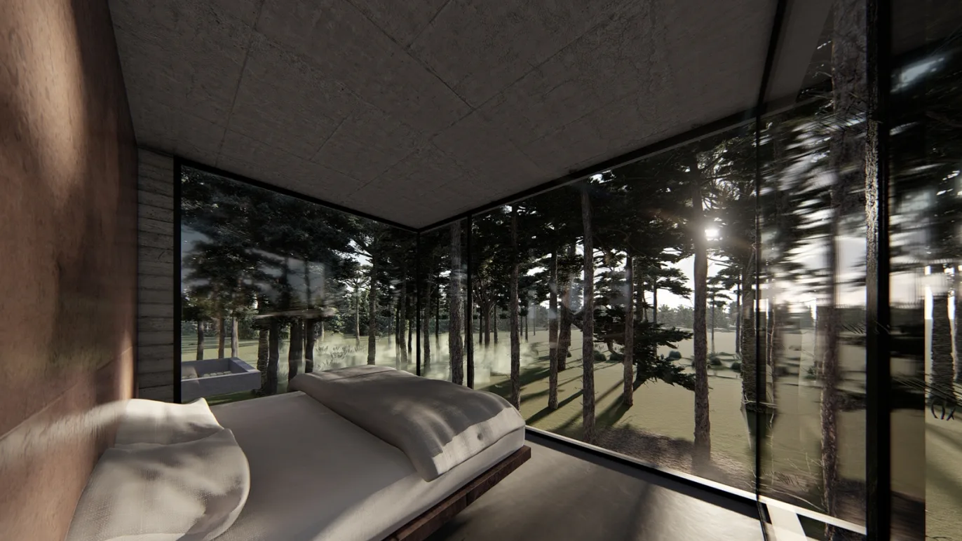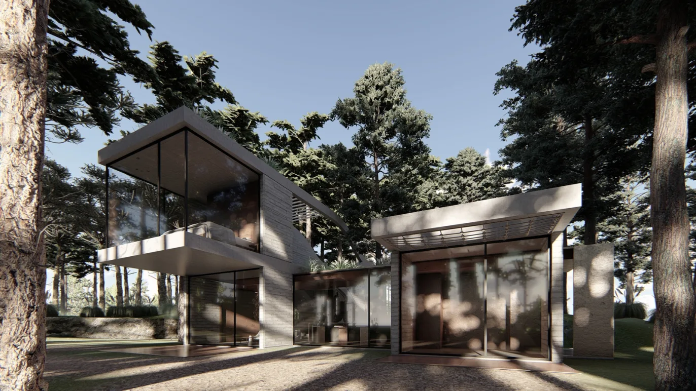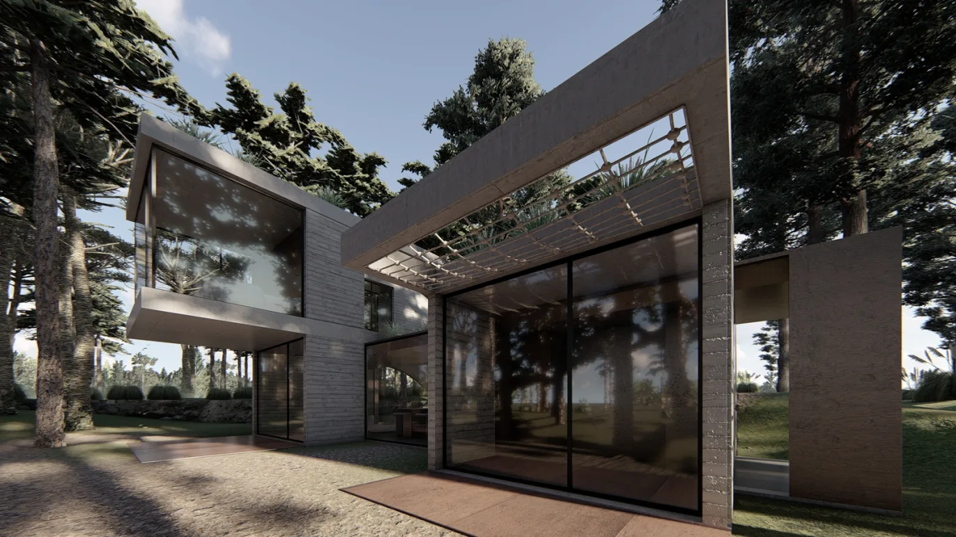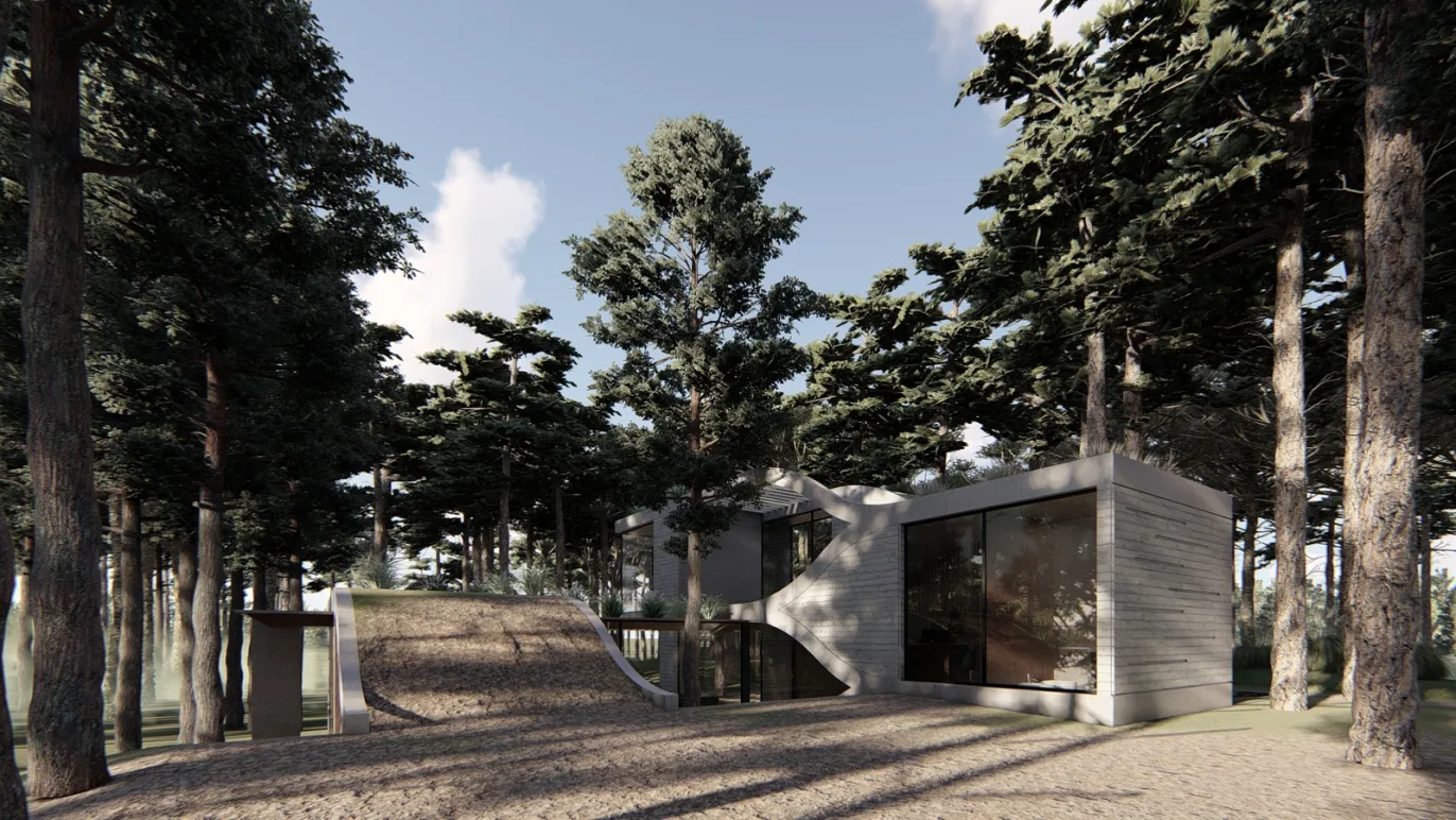 Proyecto lote insertado en el medio del bosque sobre una duna en la costa de buenos aires, argentina. Se encuentra el lote totalmente cubierto de árboles coníferas, con muchos desniveles producto de la misma duna.