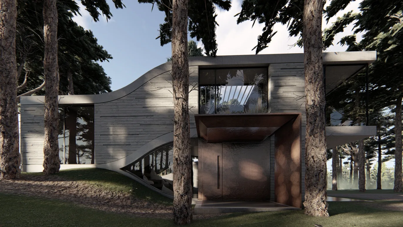 Debía representar una gran solidez para poder practicar parkour por dentro y fuera de la casa por lo cual se anclaron dos piezas de concreto que emergen desde las ondulaciones del terreno que ya viene con una geometría bien fluida. De allí tomamos estas líneas para poder “fluir” por las cubiertas de la casa y hasta para ubicar gradas interiores y exteriores para proyectar sus películas.