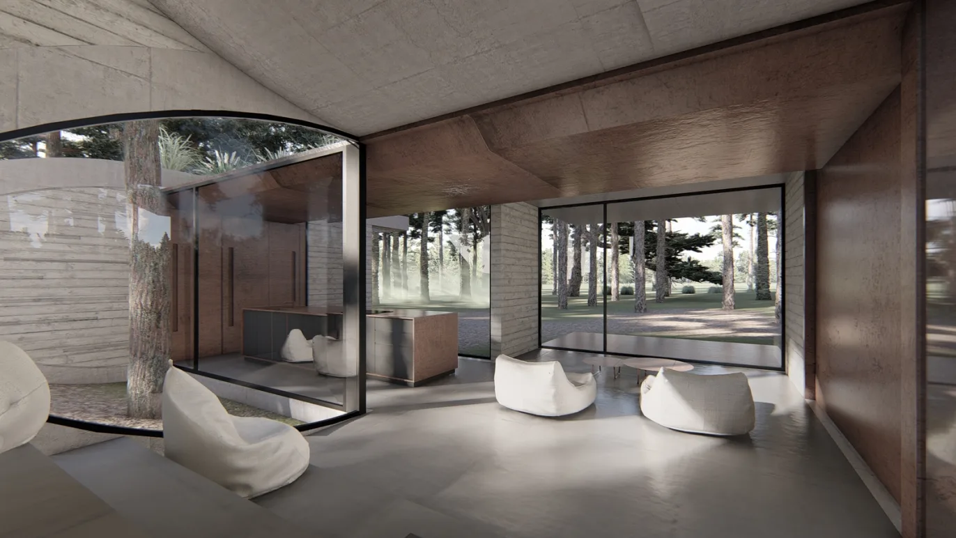 Con estos conceptos, sumados al terreno con sus potencialidades y al programa particular del dueño que quería generar en su casa un centro de reuniones donde se puedan proyectar películas de la misma temática diseñamos una vivienda muy particular.