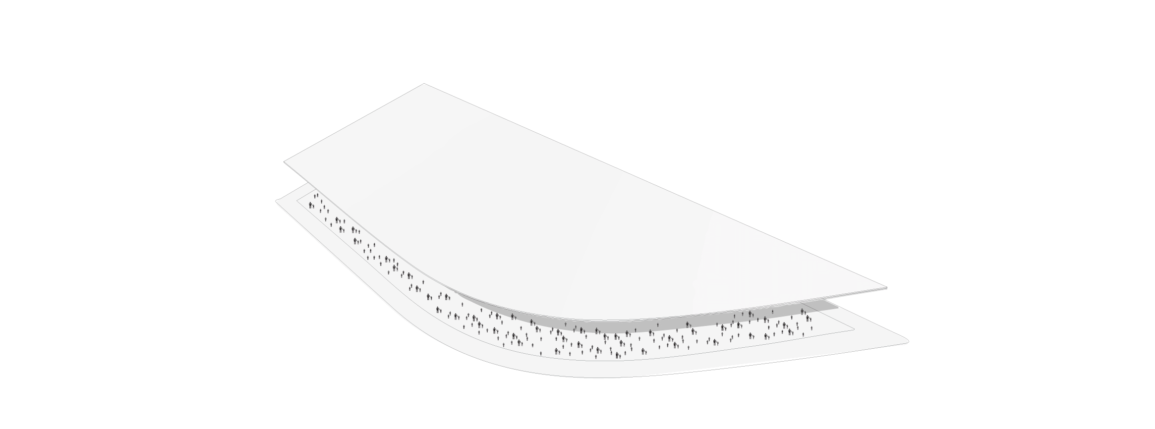Una cubierta ondulada que representa/simboliza nuestra bandera flameando acoge todo el programa, generando mediante un gesto liviano de movimiento una apertura